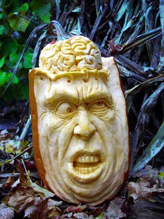 Getting the most out of a pumpkin is the basic difference between great and just ok. Here we see magnificent carving paired with exceptional creativity. Again, this is all about making more out of a Halloween staple... spilled innards.
